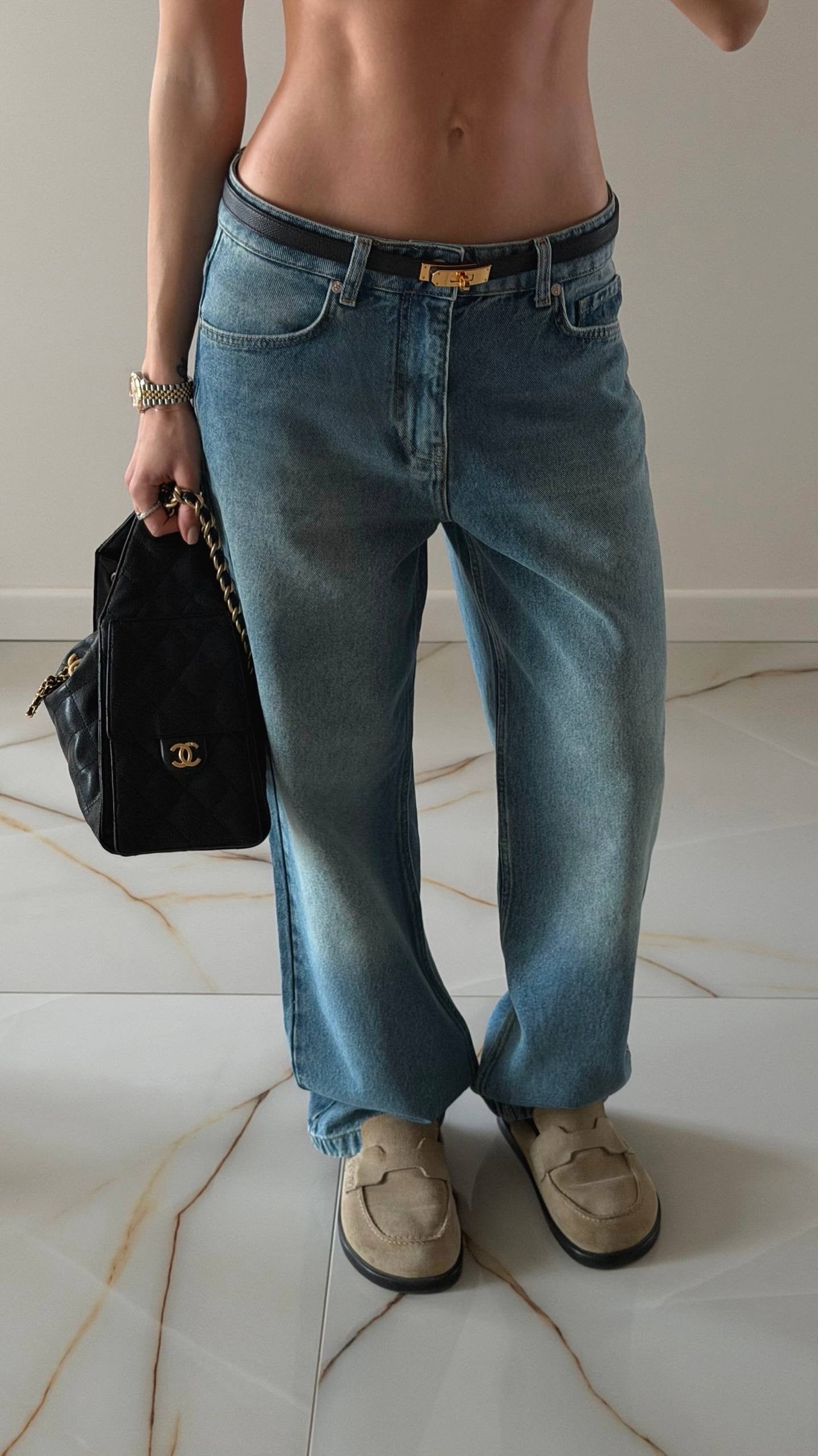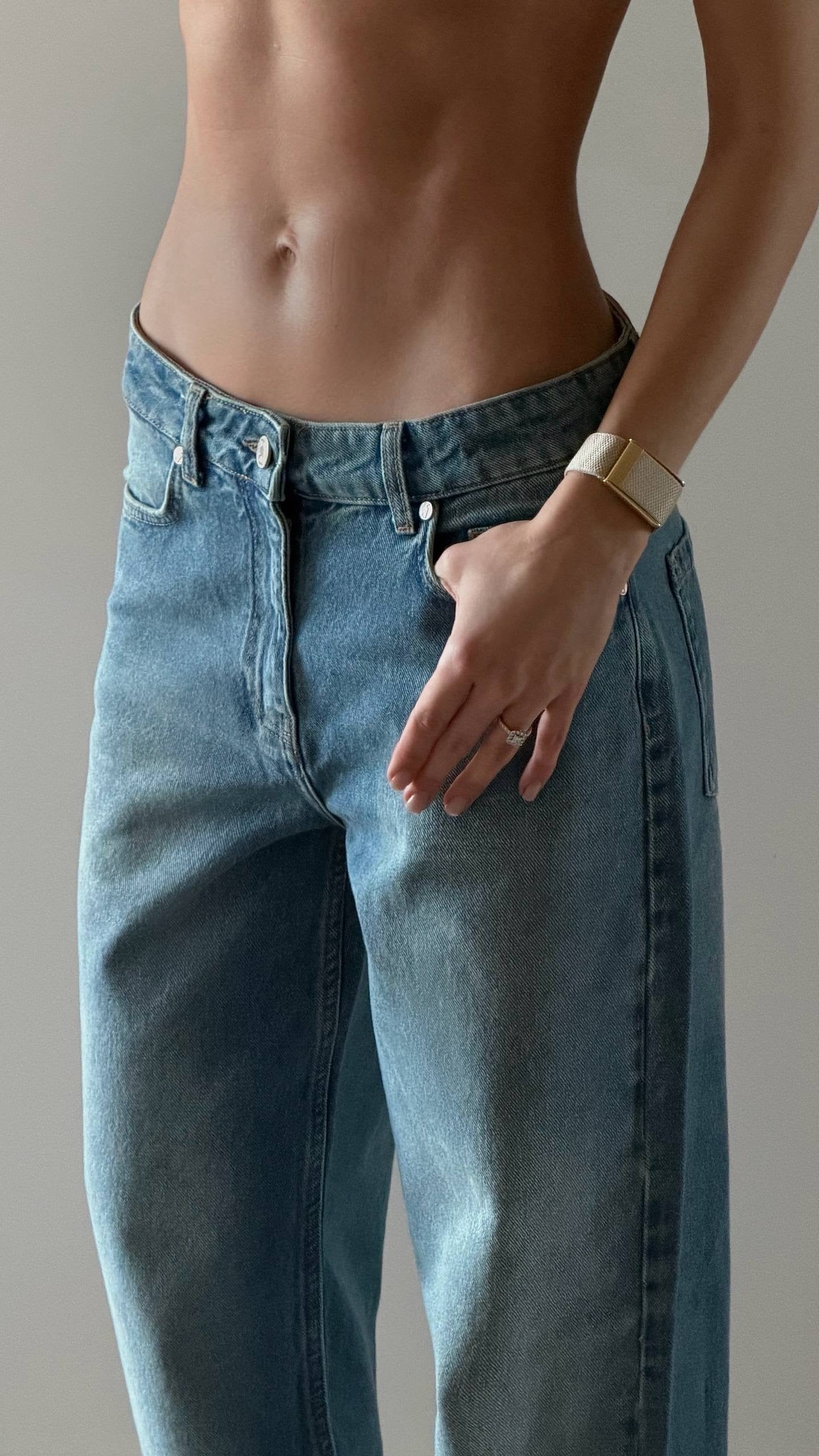Джинси прямого крою: прямий силует від талії до щиколотки, без жодних змін ширини штанини. Спереду застібка на блискавку та ґудзик. Низька посадка. Із кишенями