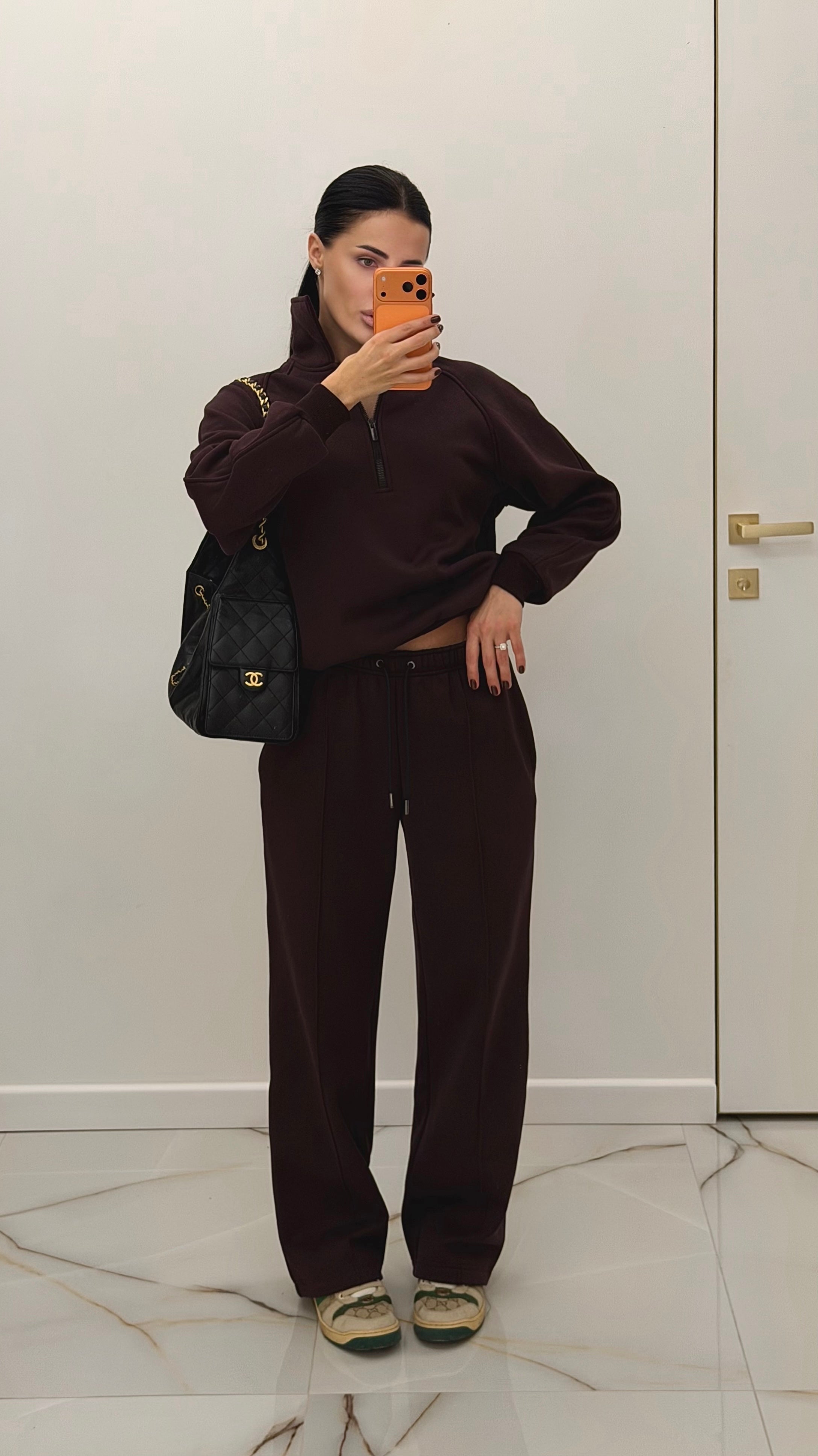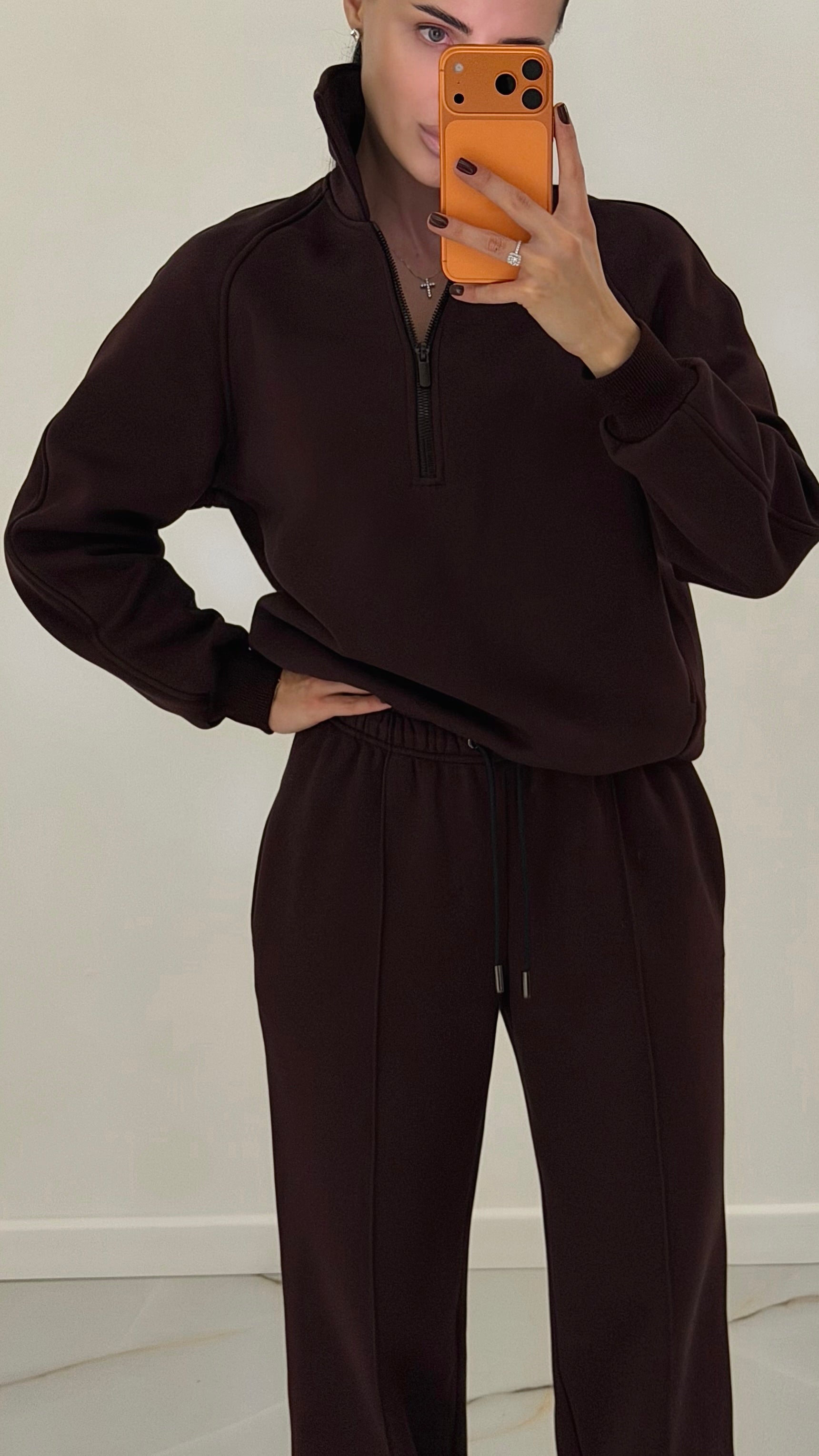 Світшот із напівблискавкою та коміром-стійкою формує лаконічний, продуманий силует. Готовий оверсайз-крій, закладений на етапі моделювання, надає свободу рухів та той самий ефект oversize без необхідності обирати більший розмір. Брюки з високою посадкою та декоративним подовжувальним швом візуально подовжують лінію ніг. За бажанням штани можна носити й нижче талії — тканина й крій це дозволяють.